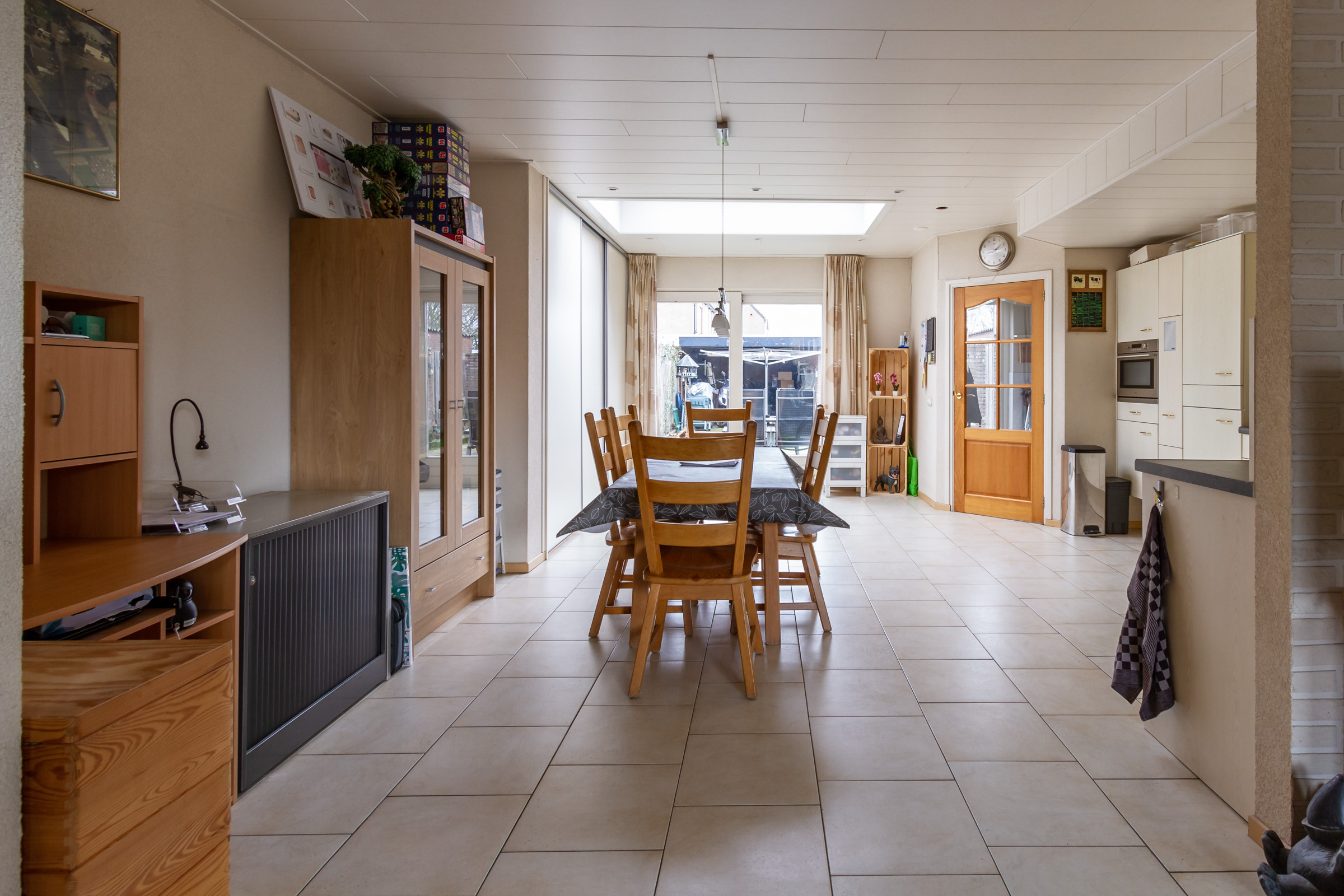 De ruime woonkamer geniet van veel lichtinval door grote raampartijen aan de voor- en achterzijde. Er is een nette lichte tegelvloer met vloerverwarming. De woonkamer beschikt tevens over een schuifpui naar de achtertuin, een trapkast en een vaste inbouwkast.