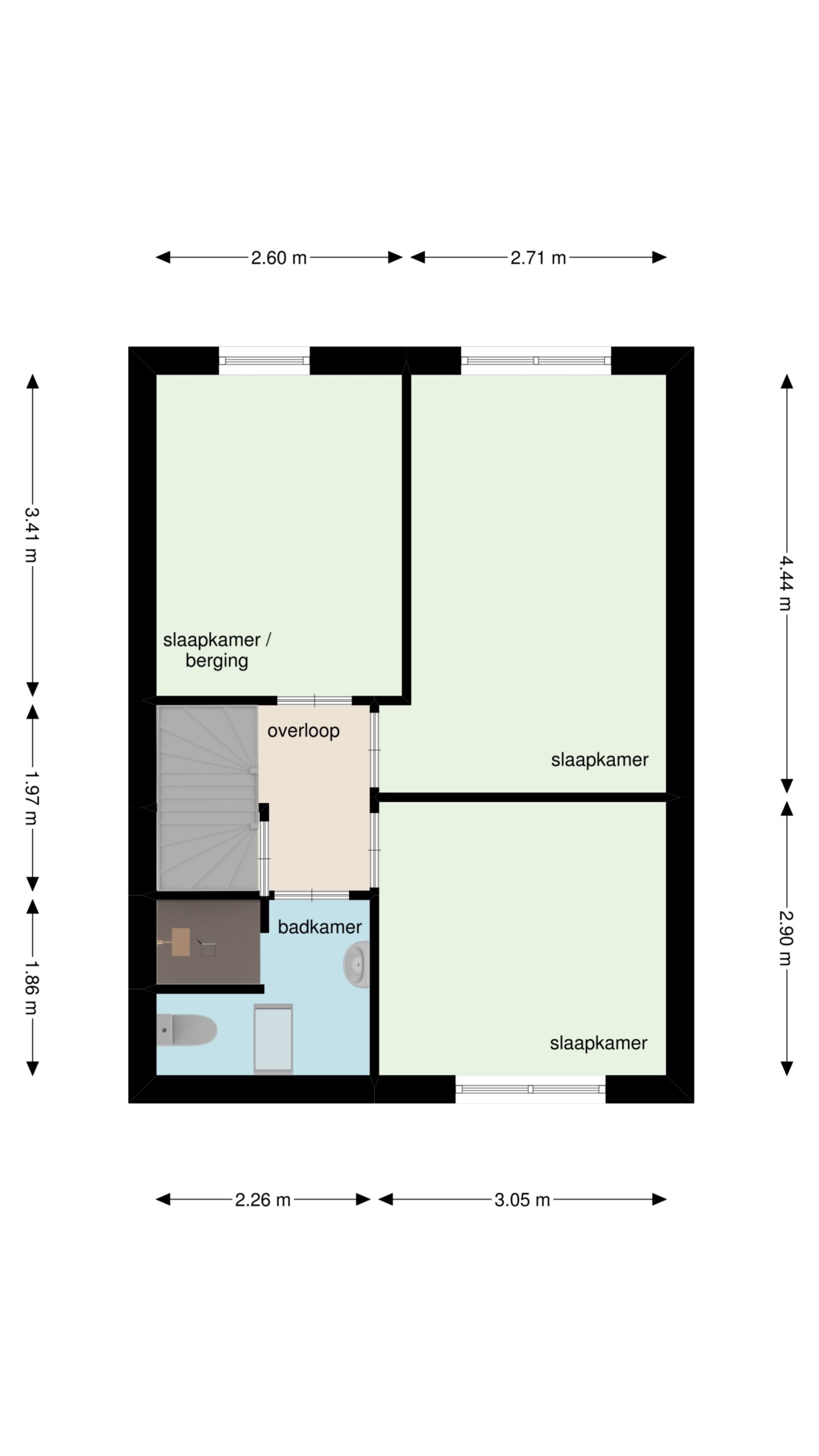 - Slaapkamer 3 (circa 9 m²) bevindt zich aan de achterzijde.