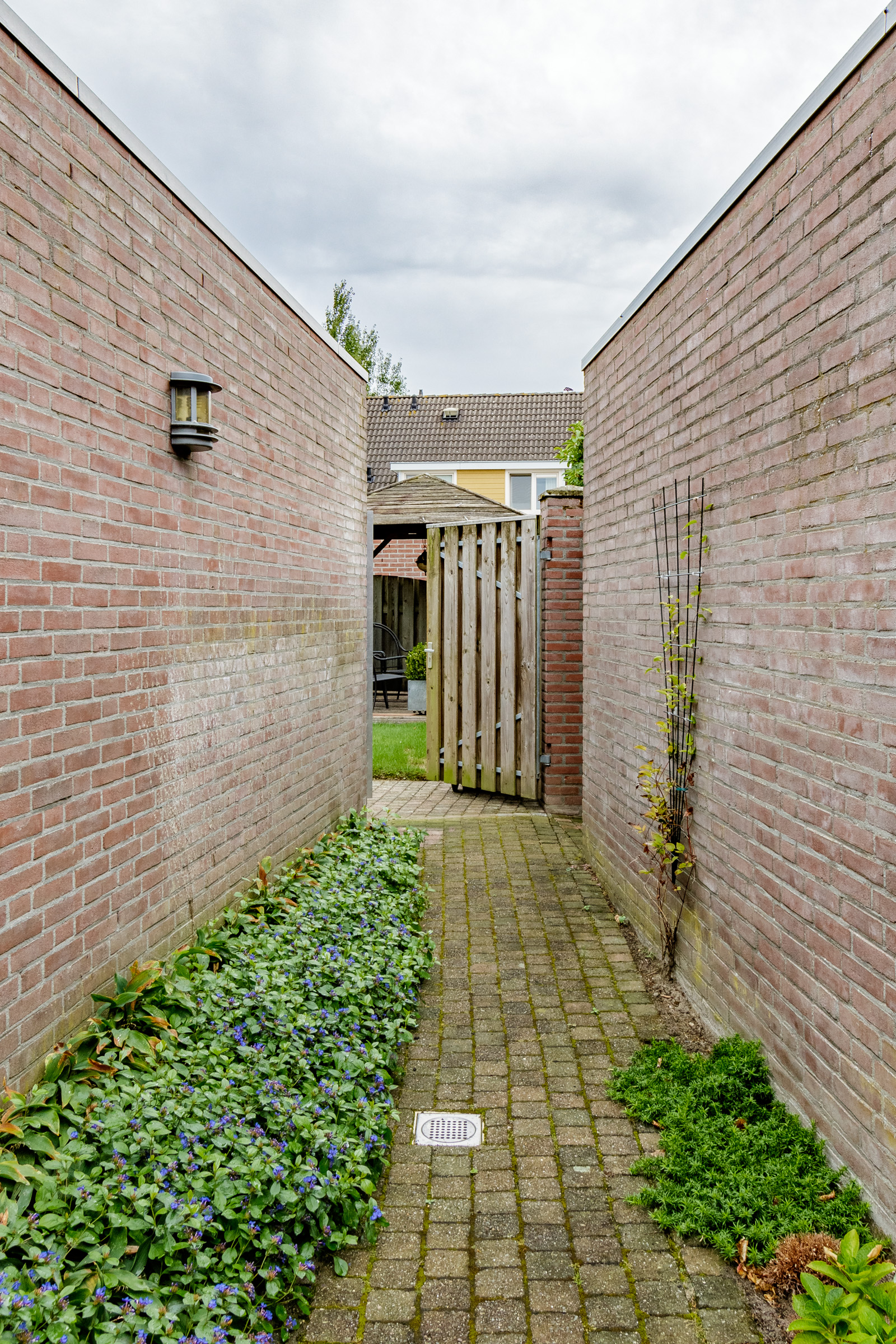 Keurig aangelegde voortuin met oprit geschikt voor twee auto’s. Via achterom te bereiken achtertuin.