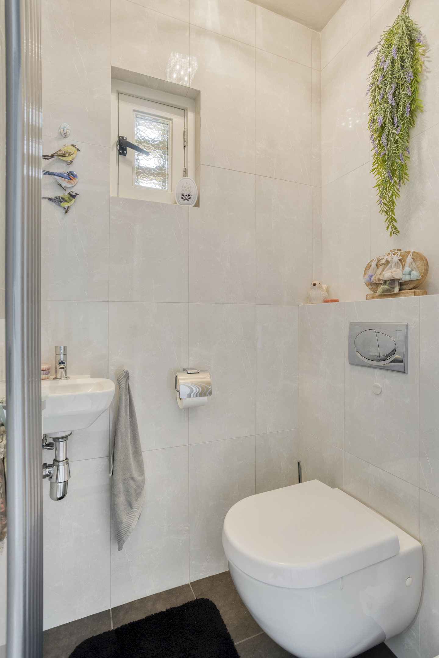 Geheel betegelde toiletruimte met vrij hangend closet en fonteintje.