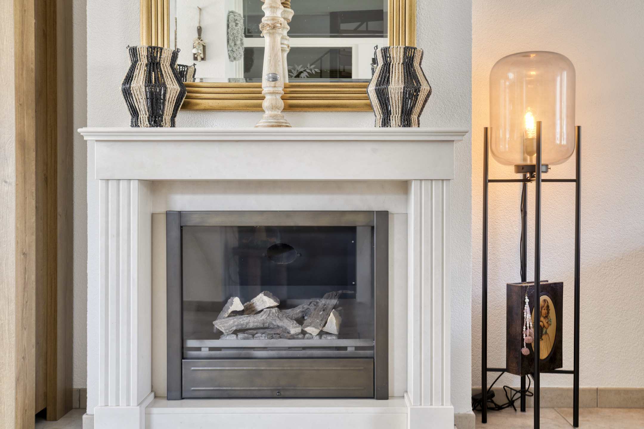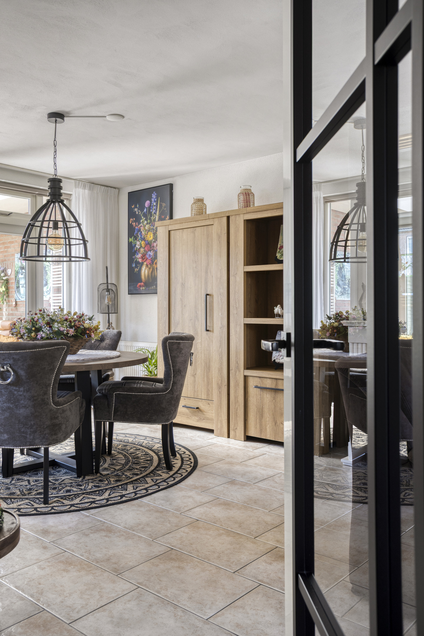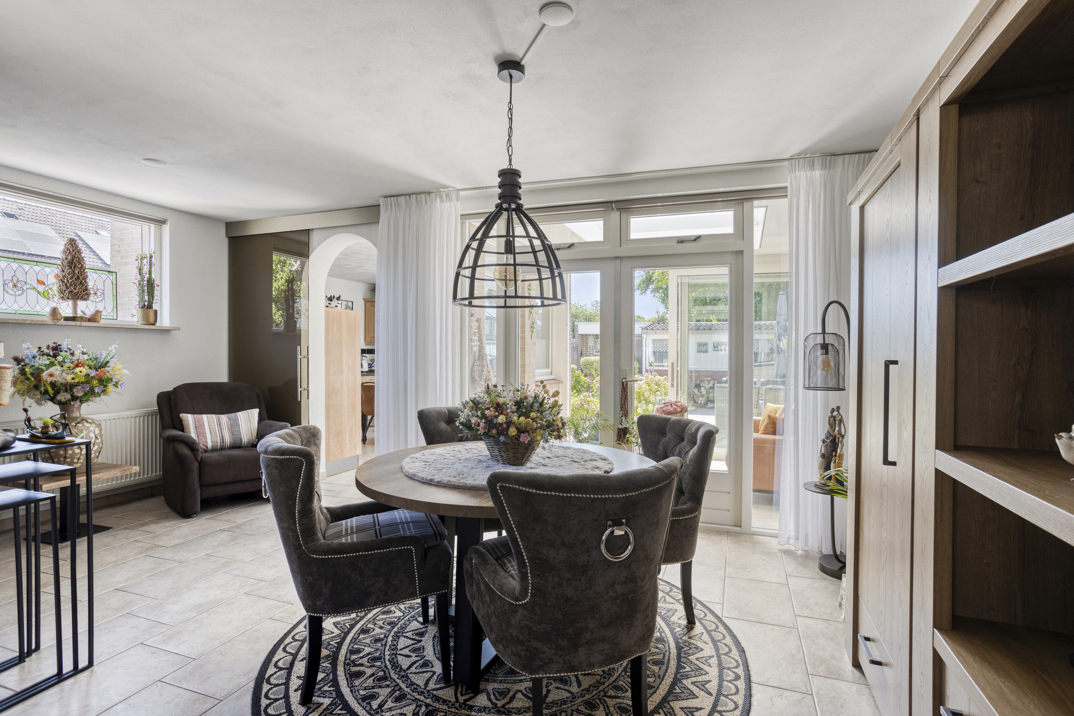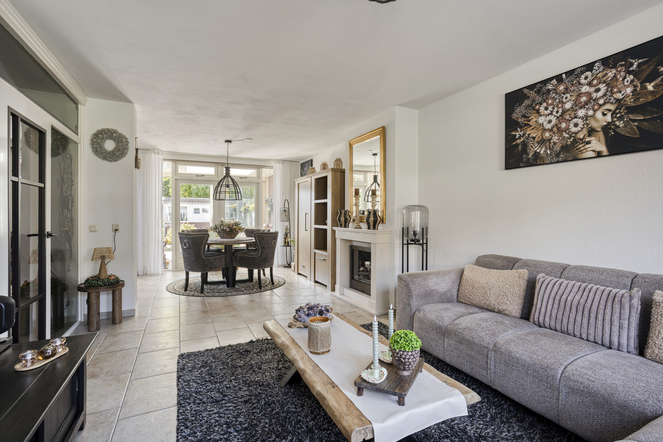 Ruime L-vormige woonkamer met veel lichtinval van verschillende kanten. Voorzien van tegelvloer, gashaard en openslaande deuren naar de serre. Via een schuifdeur is tevens de keuken bereikbaar.