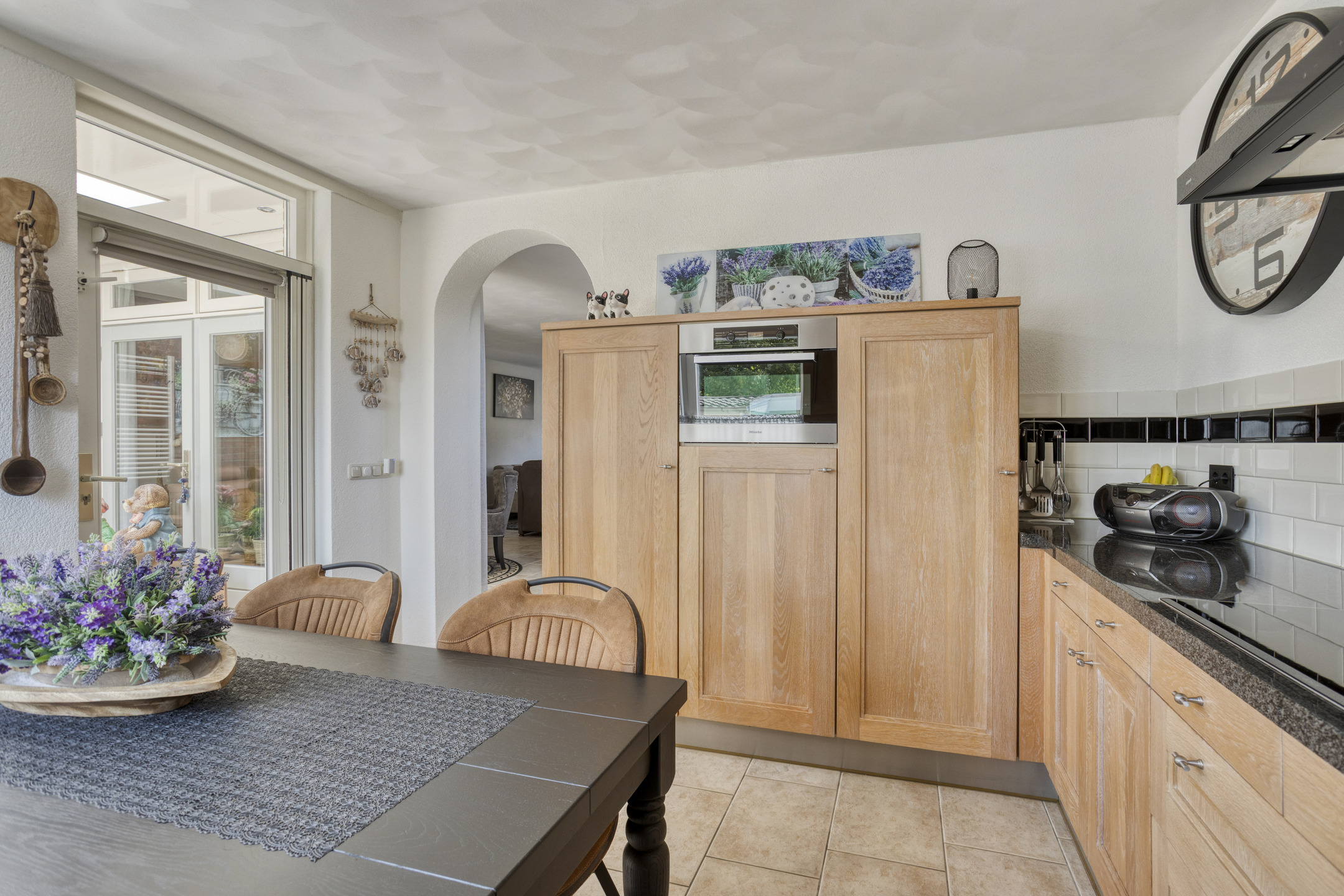 In de uitbouw gelegen ruime leefkeuken. De keuken heeft een u-opstelling en is uitgerust met een granietenwerkblad, 5-pits inductiekooplaat, afzuiging, inbouw vaatwasser, koelkast en combi magnetron. Alle apparaten zijn uitgevoerd in A-kwaliteit van Miele.