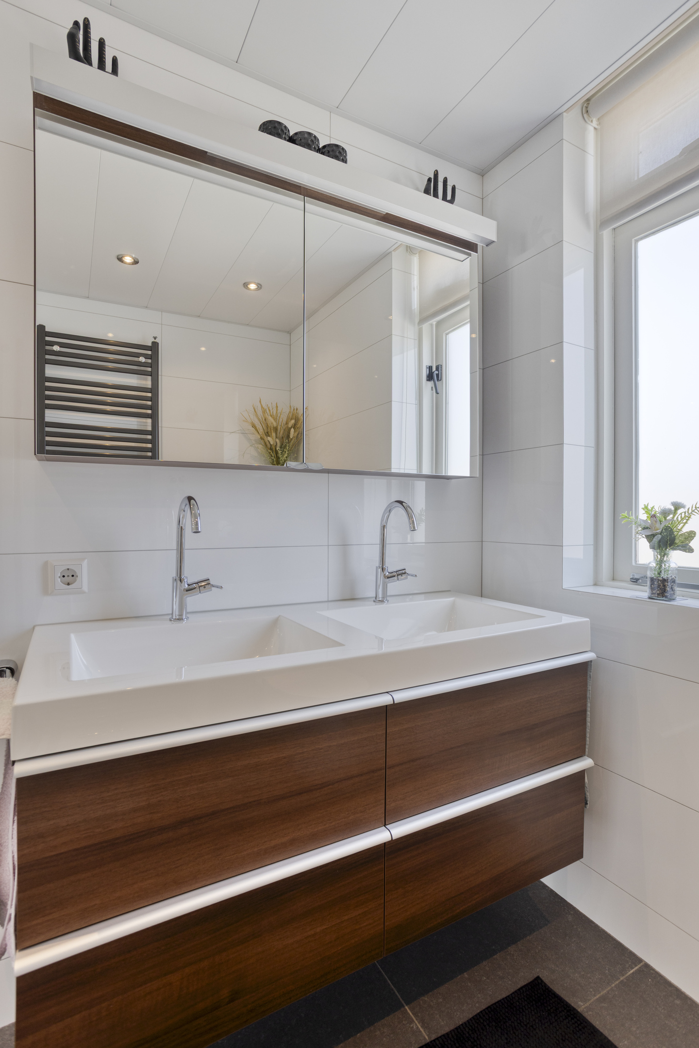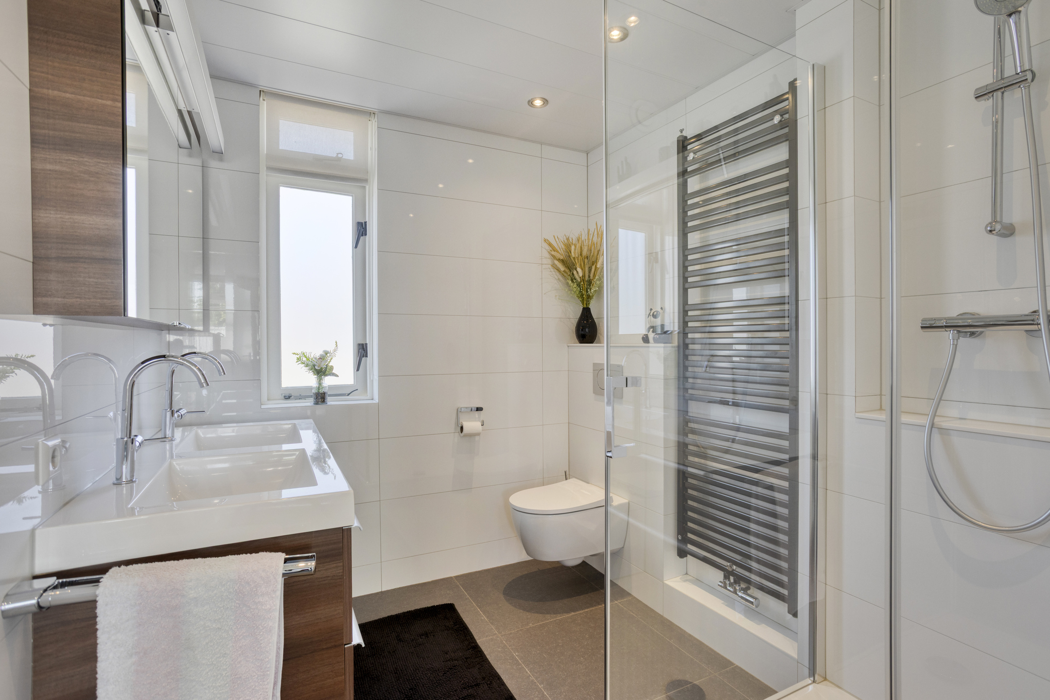 Twee ruime slaapkamers en een derde middelgrote slaapkamer. De badkamer is een nette, moderne badkamer, geheel betegeld en voorzien van een ruime douche, hangcloset, design radiator en wasmeubel met dubbele wasbak.
