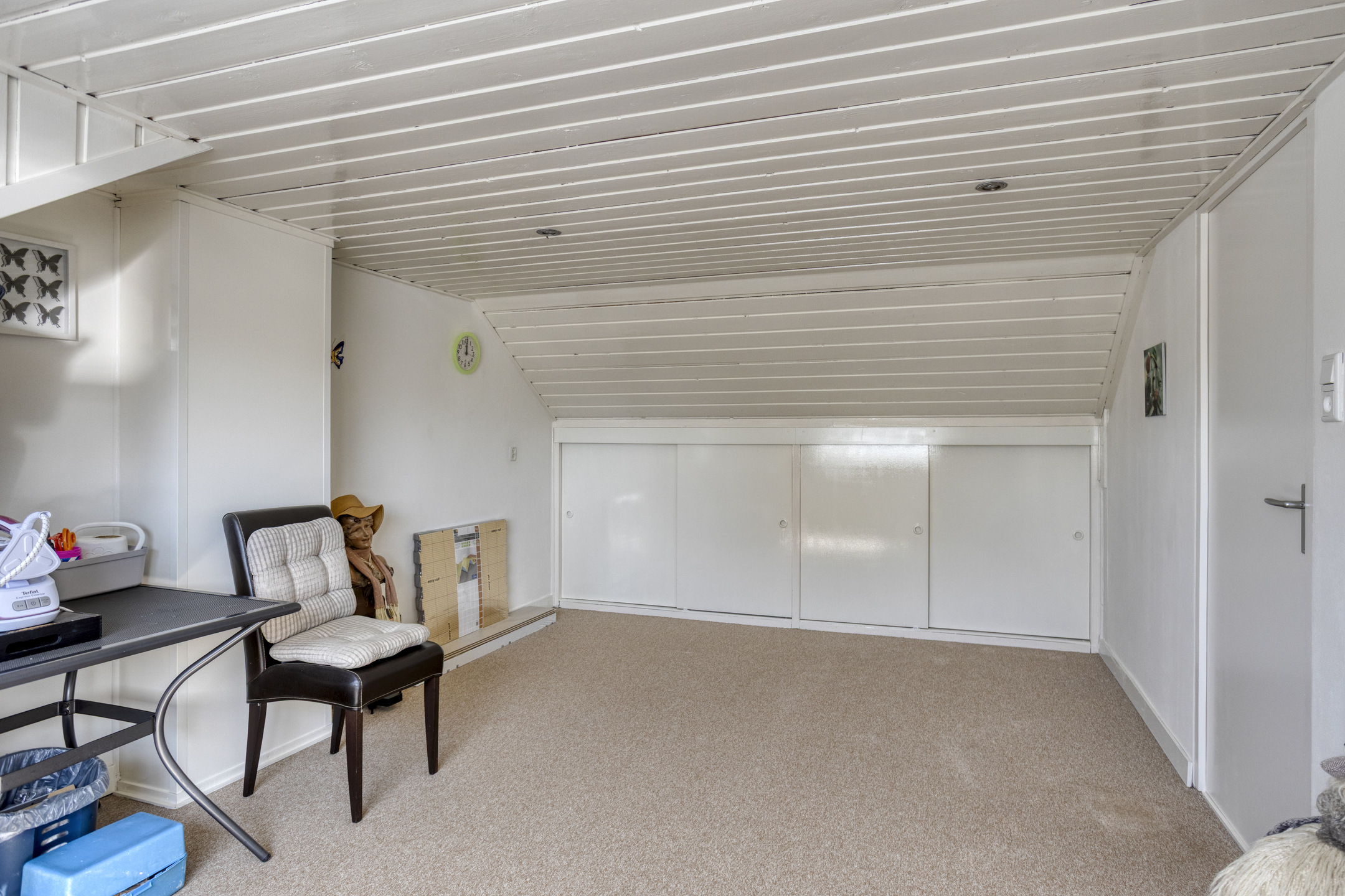 Grote zolderkamer met dakkapel en bergruimte onder de schuinte van de kap, weggewerkt met schuifdeurtjes.