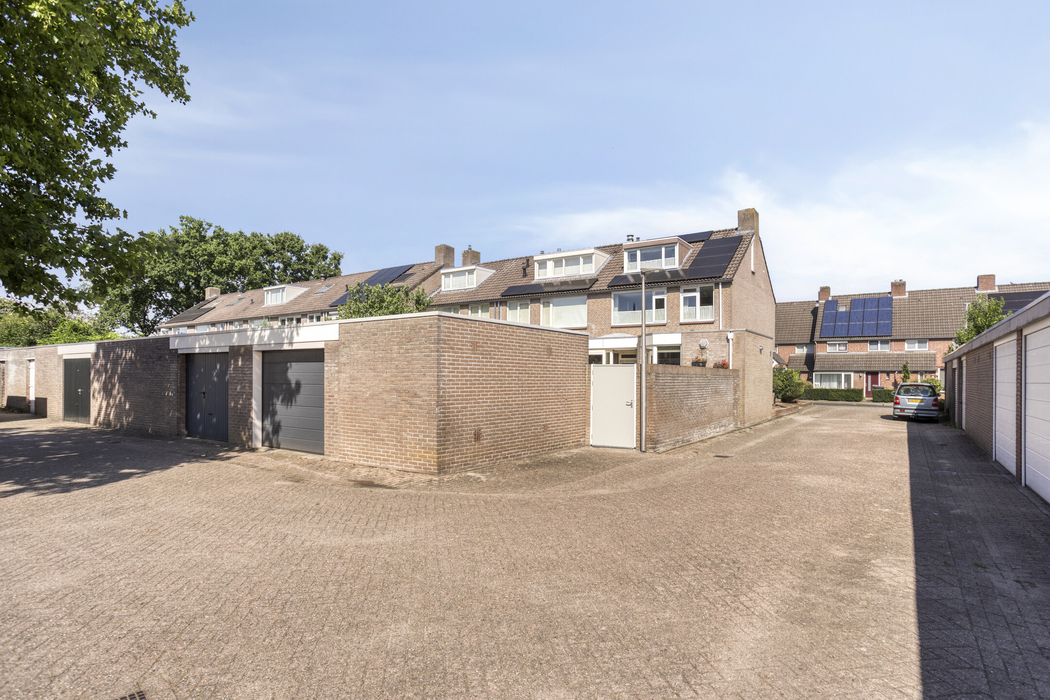 Grotendeels bestraatte achtertuin met plantenborder, achterom, ruime berging en grote garage met elektrische sectionaalpoort.