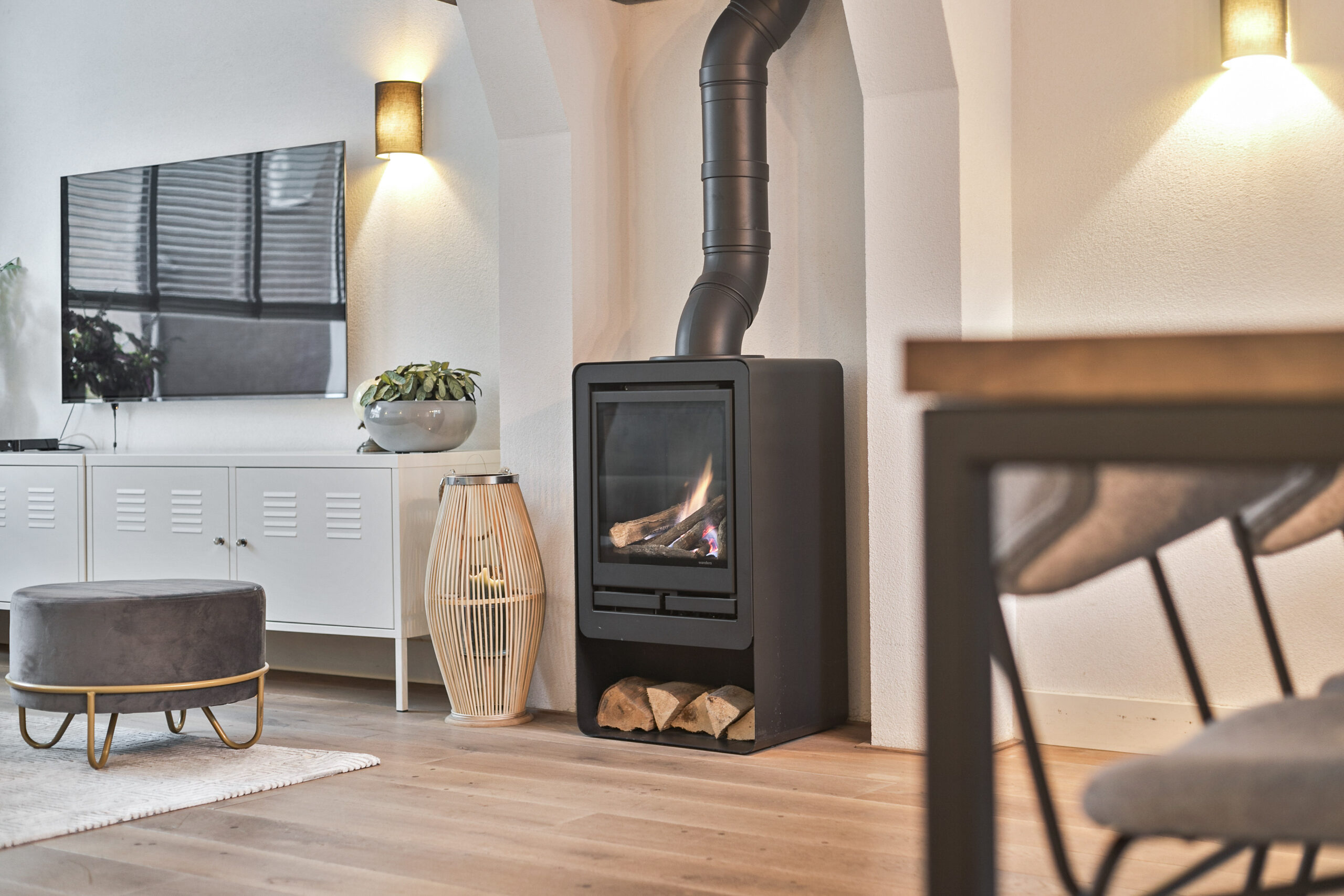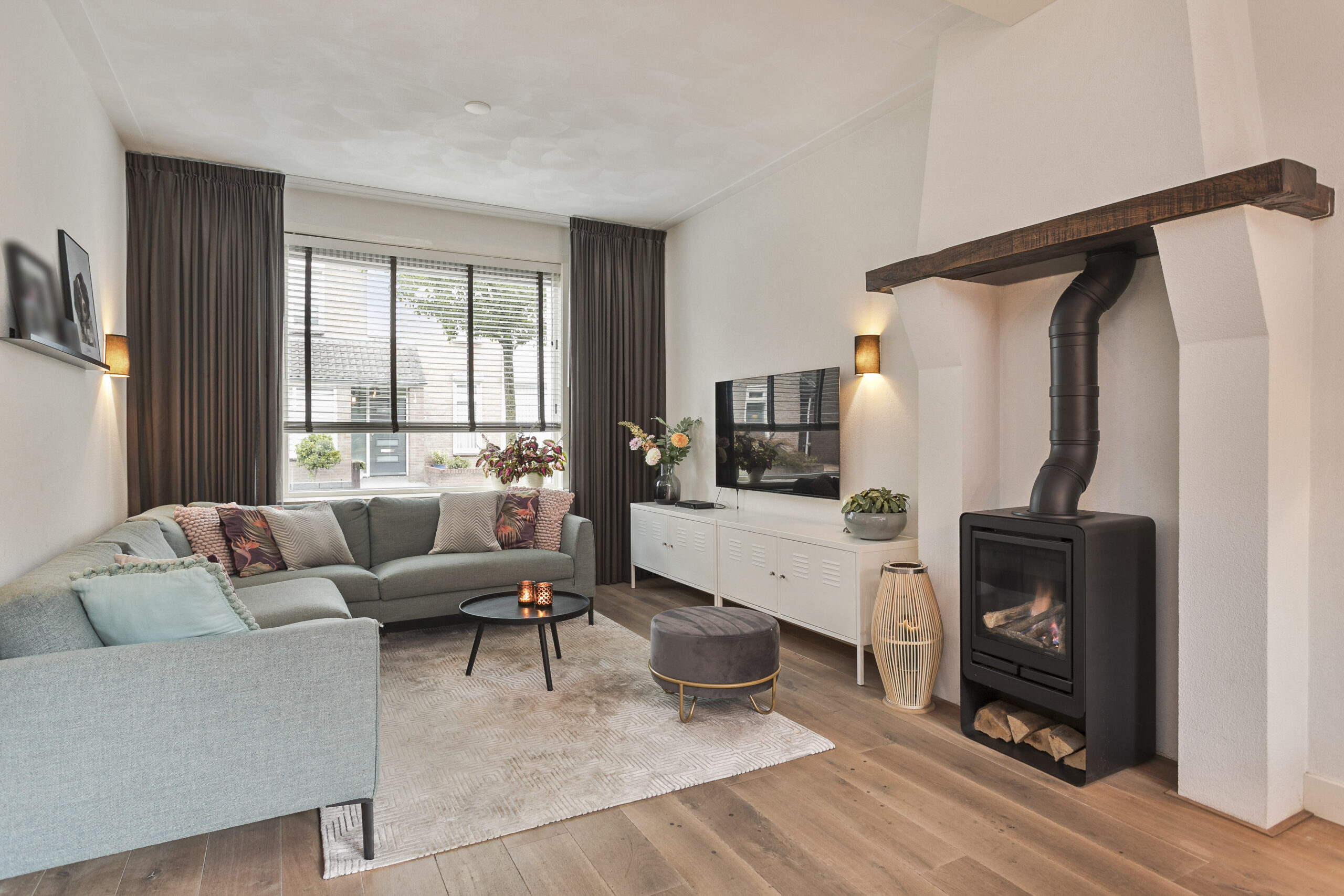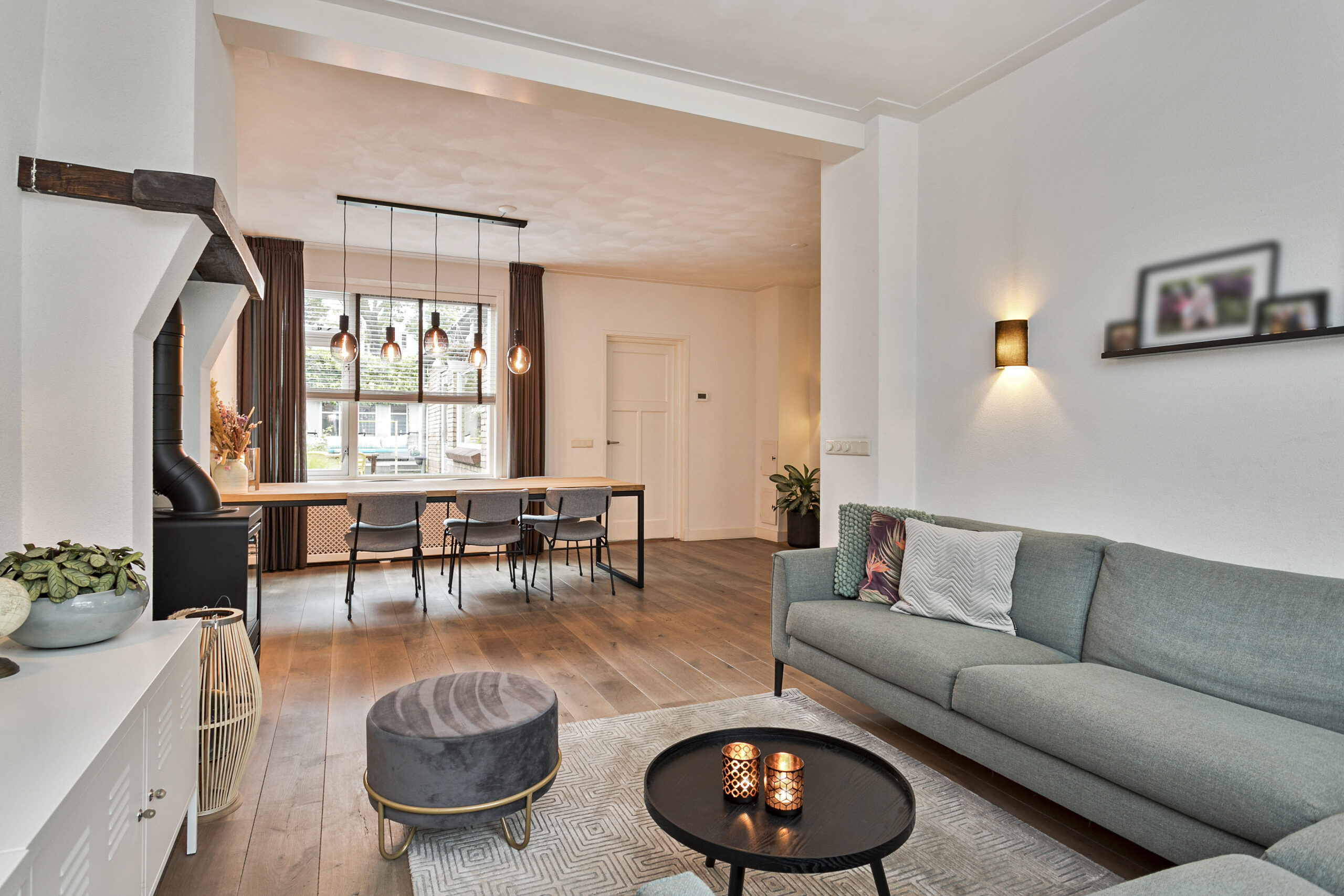 Ruime woonkamer voorzien van veel lichtinval vanwege grote ramen aan de voor- en achterzijde, houtenvloer en schouw met gaskachel.