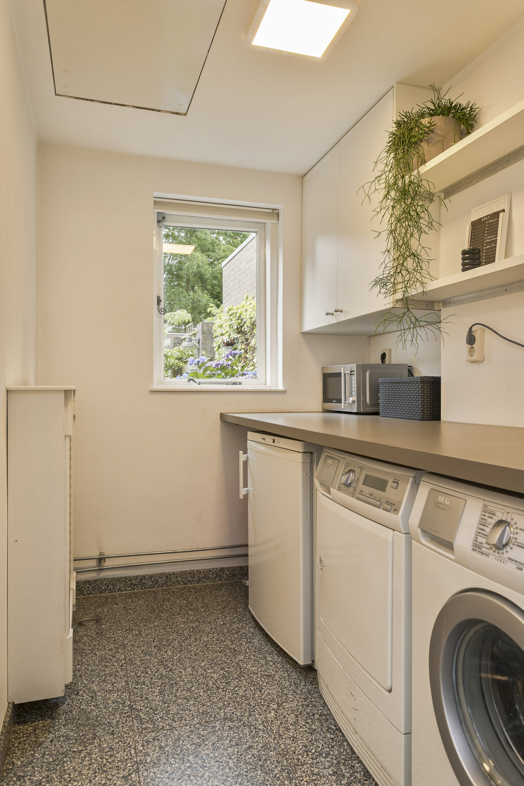 Aan de achterzijde van de woning gelegen bijkeuken met aansluitingen voor wasapparatuur, toegang tot toilet, achtertuin en met vlizotrap te bereiken vliering.