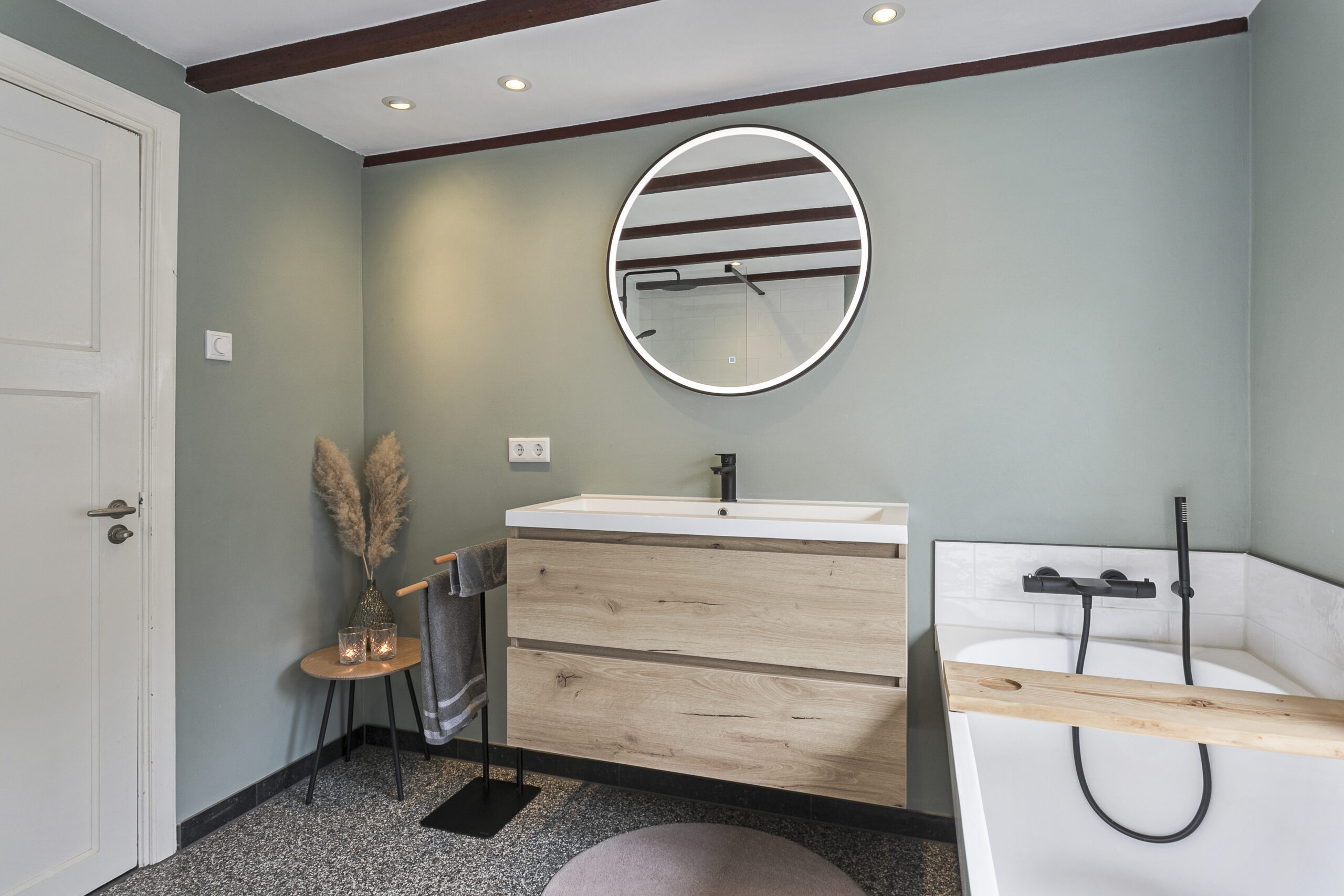In 2021 vernieuwde badkamer voorzien van wastafelmeubel, ligbad, hangcloset en inloopdouche.