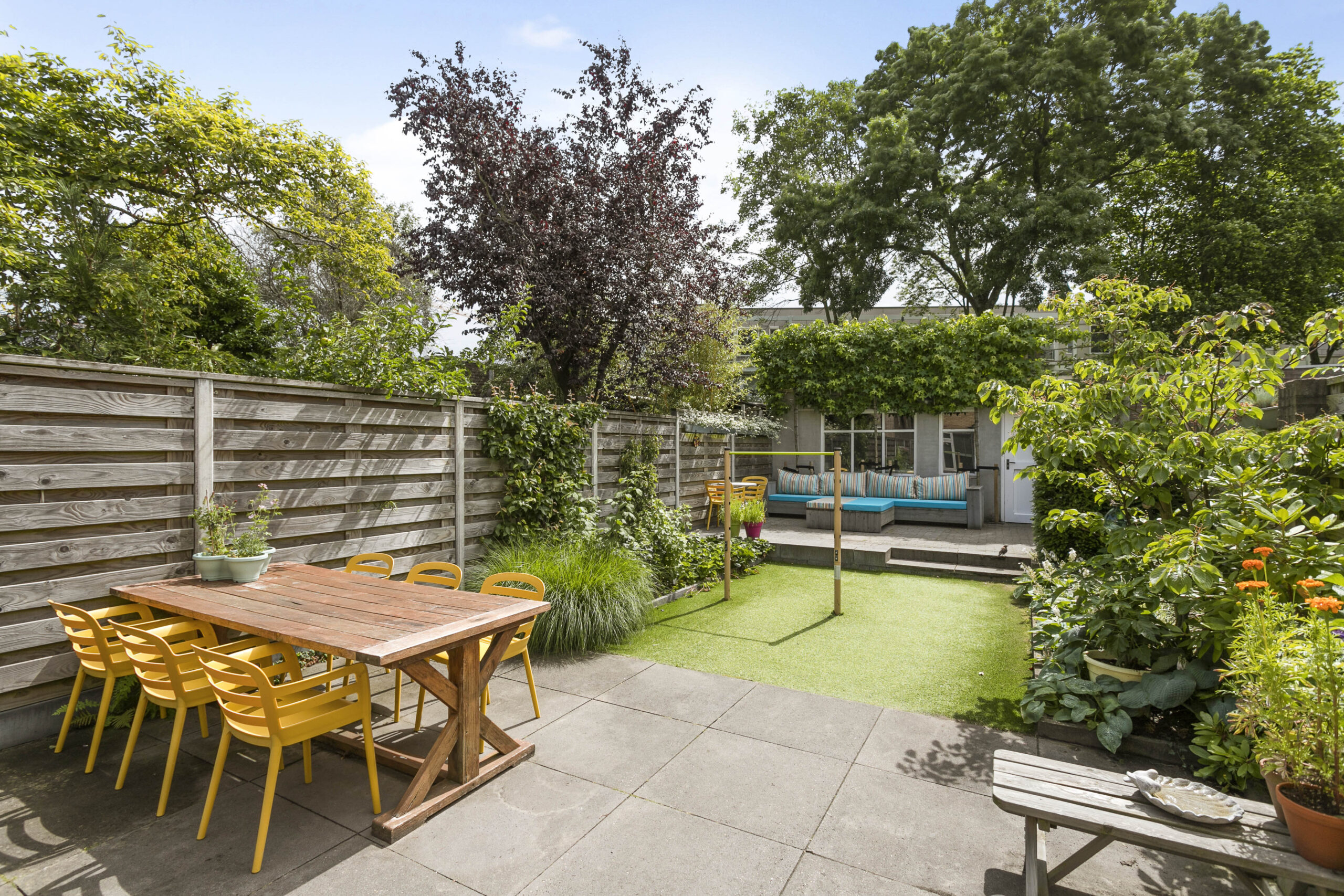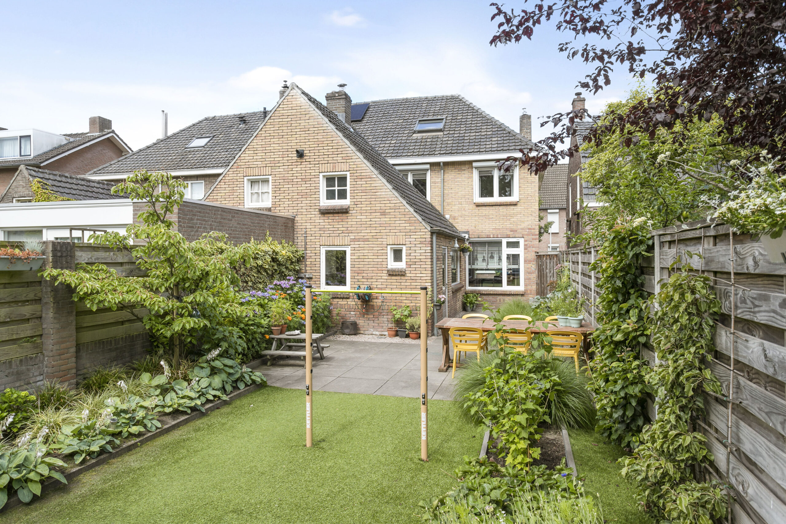 Fraai aangelegde achtertuin voorzien van sierbestrating, kunstgras en diverse borders met beplanting. Verschillende zitplekken en een achterom.